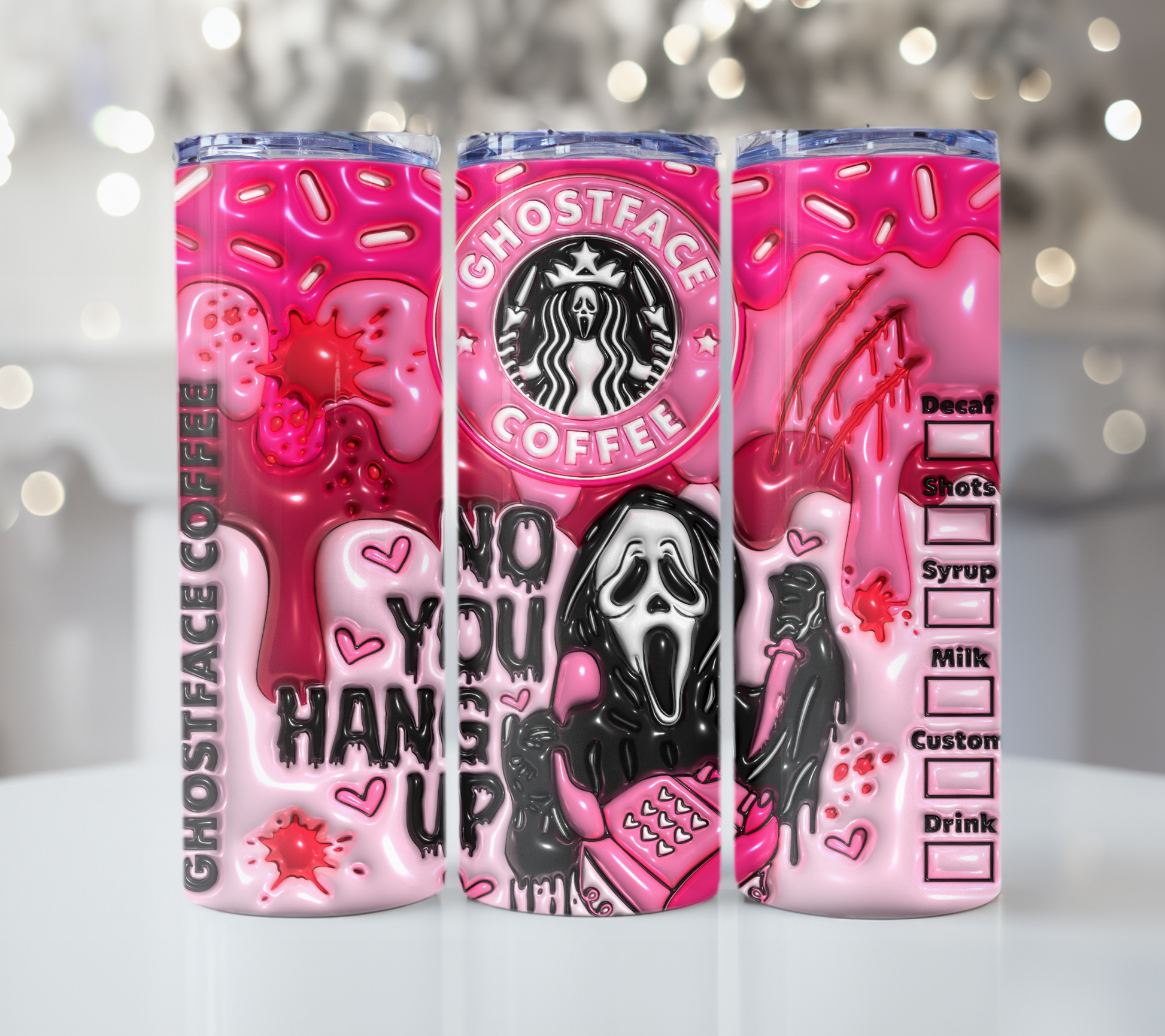 Brought to you by Ghostface Coffee (wink, no affiliation with that other famous coffeehouse πŸ˜‰), this tumbler creates a chilling 3D illusion that will have you doing a double-take every time you reach for a sip. It's spooky fun in a cup! πŸŽƒβœ¨