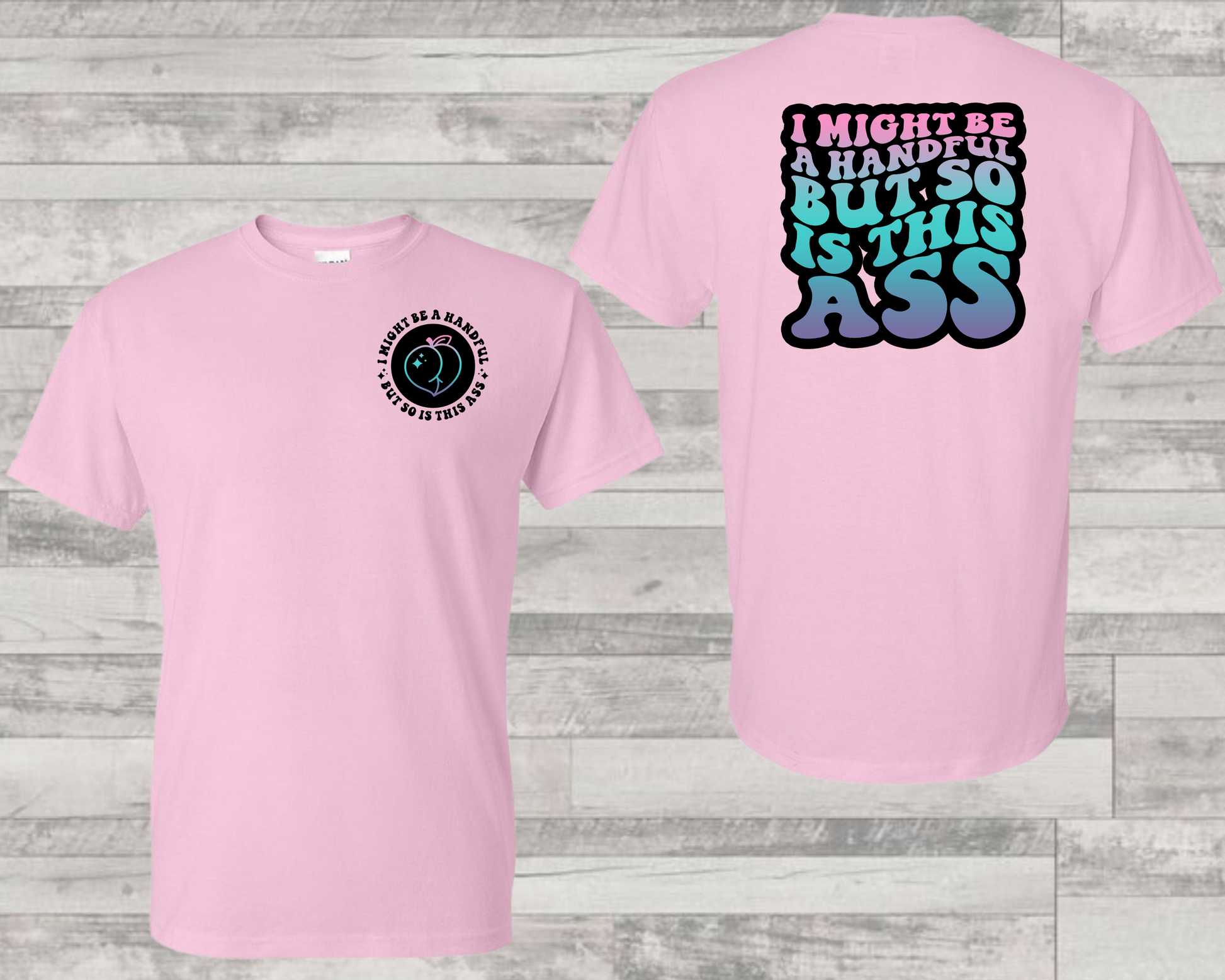 Double the trouble, double the fun! Our shirt proclaims, "I might be a handful, but so is this ass." For those who embrace their bold personalities and curves with equal enthusiasm. Strut with sass and let the shirt do the talking. 🍑✨  #DoubleTrouble #SassAndAss #BoldAndBootyful #HandfulHighlights #CheekyCharm